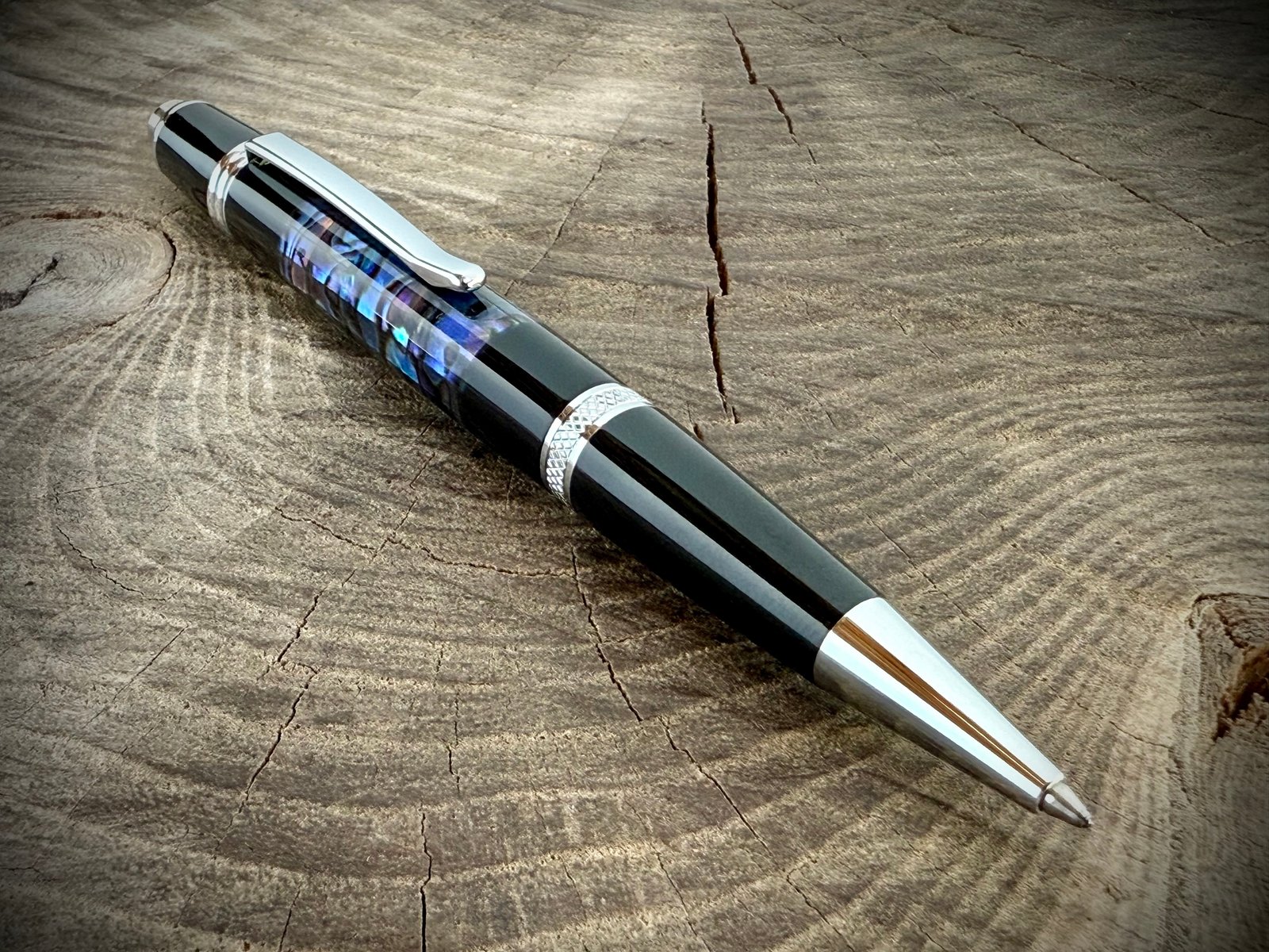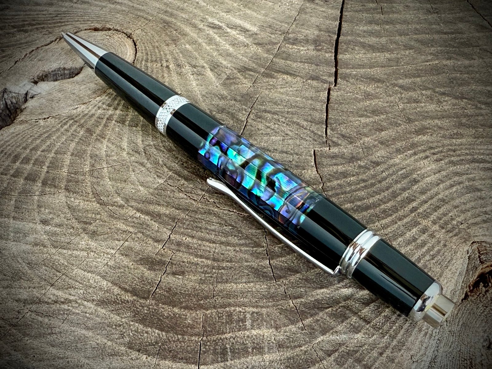 This handcrafted Abalone ballpoint click pen is a testament to artistry and the beauty of nature. Iridescent paua abalone seashell, a masterpiece of the sea, is encased in crystal-clear epoxy resin to display the shell’s vibrant colors in stunning detail. Chrome accents and a comfortable knurled center band add a touch of sophistication. The pen operates with a smooth click mechanism, offering both elegant design and practical everyday use.