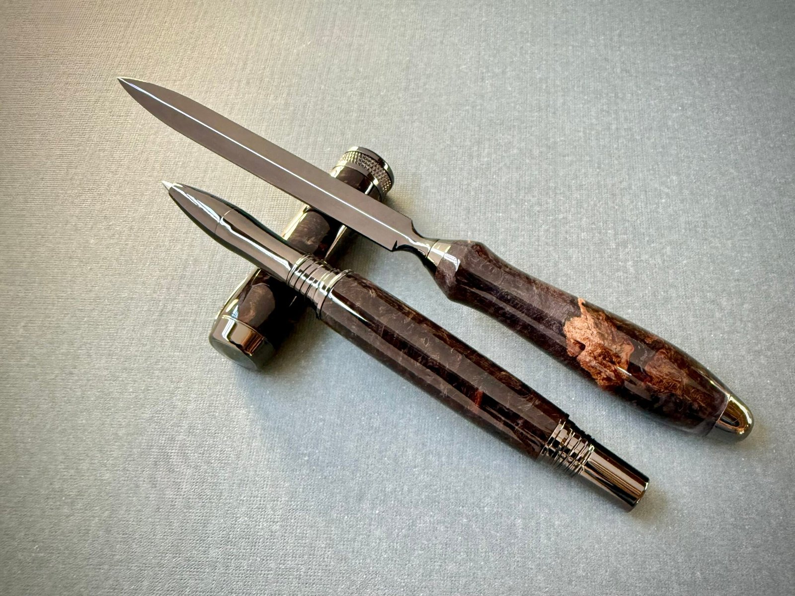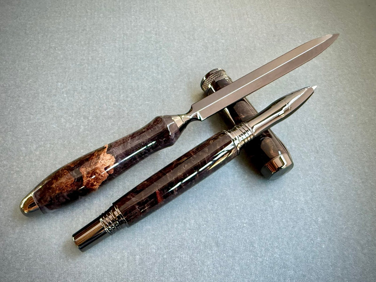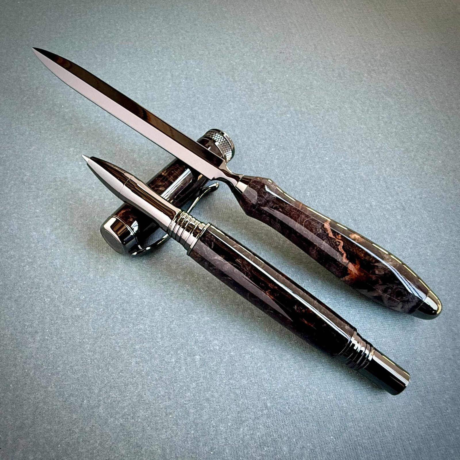 This handcrafted black burl gift set features maple burl dyed a deep, midnight black for a sleek and modern look. While it appears solid at first glance, a hand-polished mirror finish reveals the natural swirling grain hidden just beneath the surface. Each pen is turned by hand and protected by ten durable layers, making it a sophisticated and artistic tool for any desk.