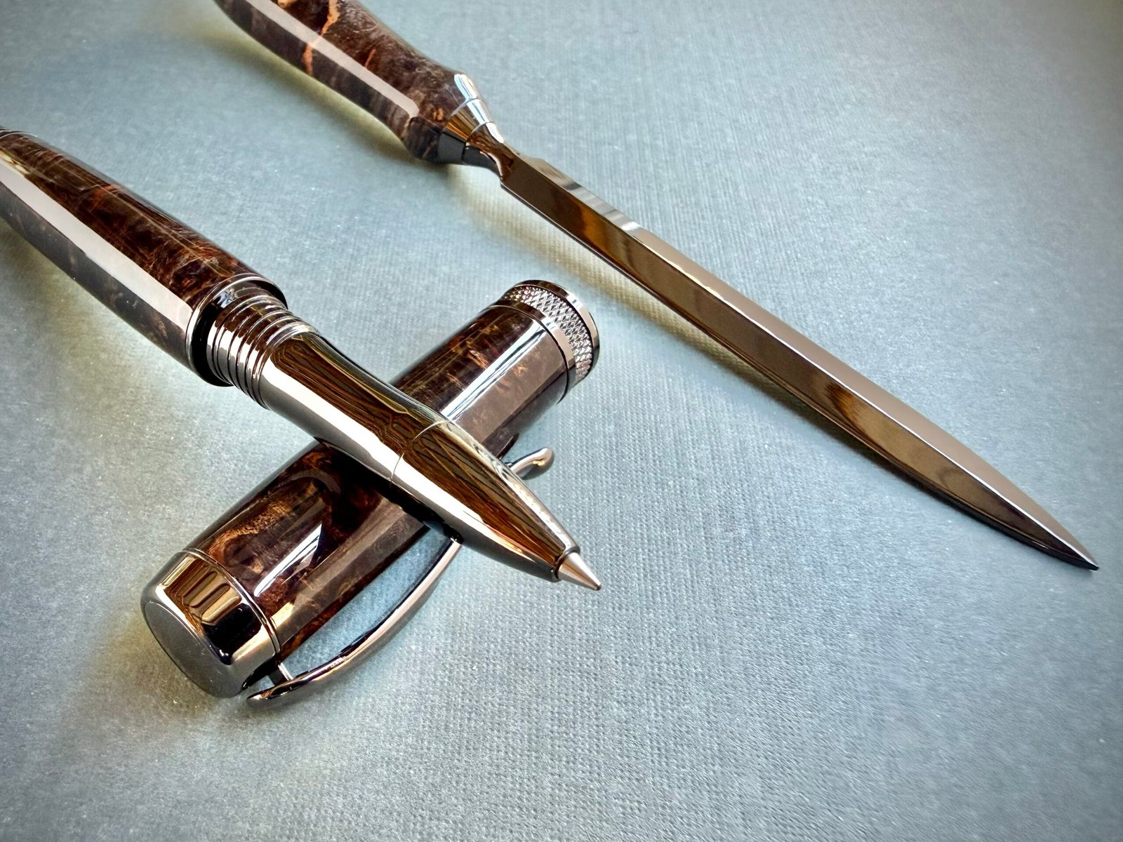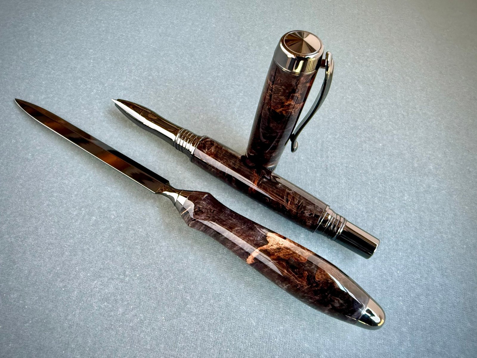 The set includes a capped pen and sleek letter opener with gunmetal plated fittings and blade.