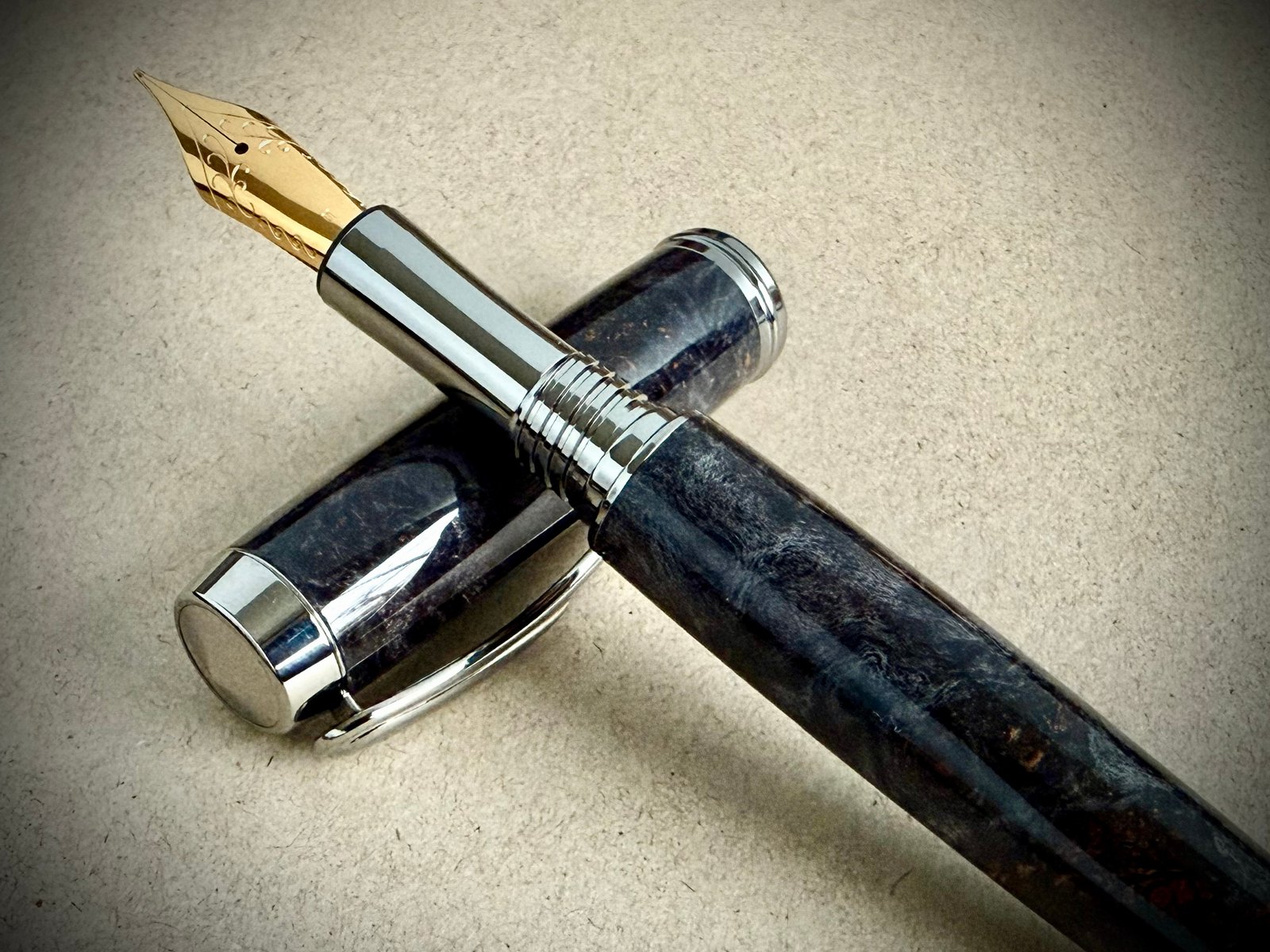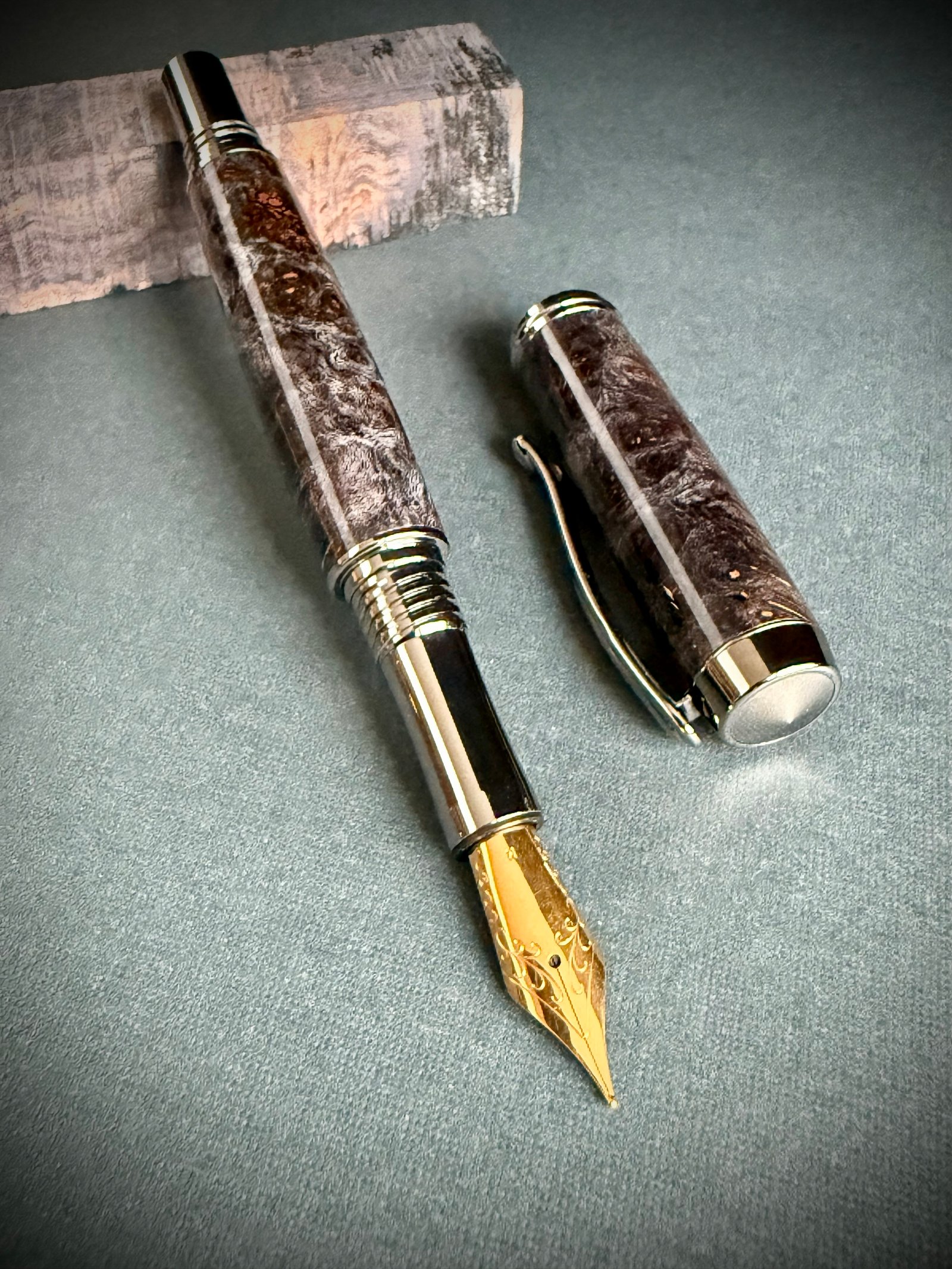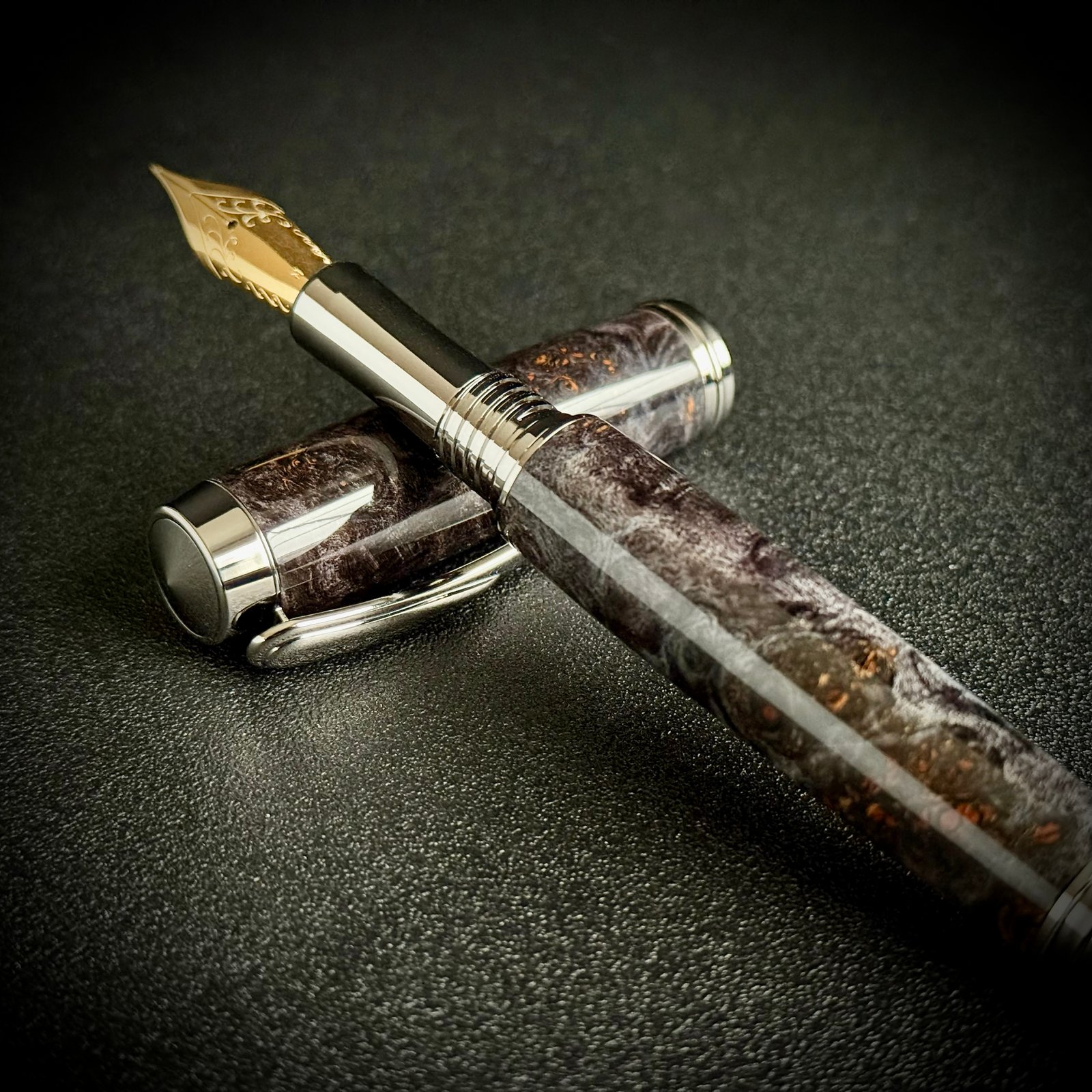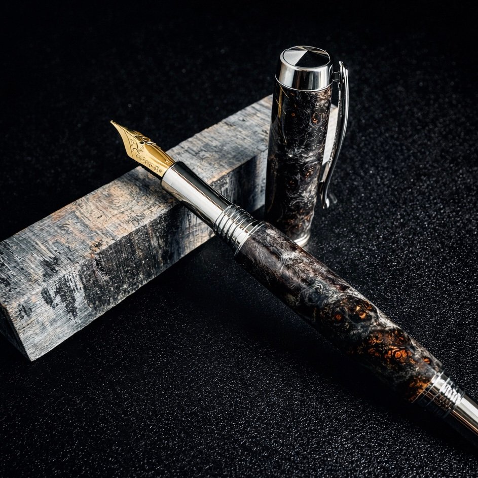 This handcrafted black maple burl fountain pen captures a striking balance between natural complexity and modern elegance. I lathe-turn the dyed and stabilized wood to reveal a dark, swirling grain that resembles a landscape of shadows, ensuring each contour of the pen feels comfortable and balanced in the hand.