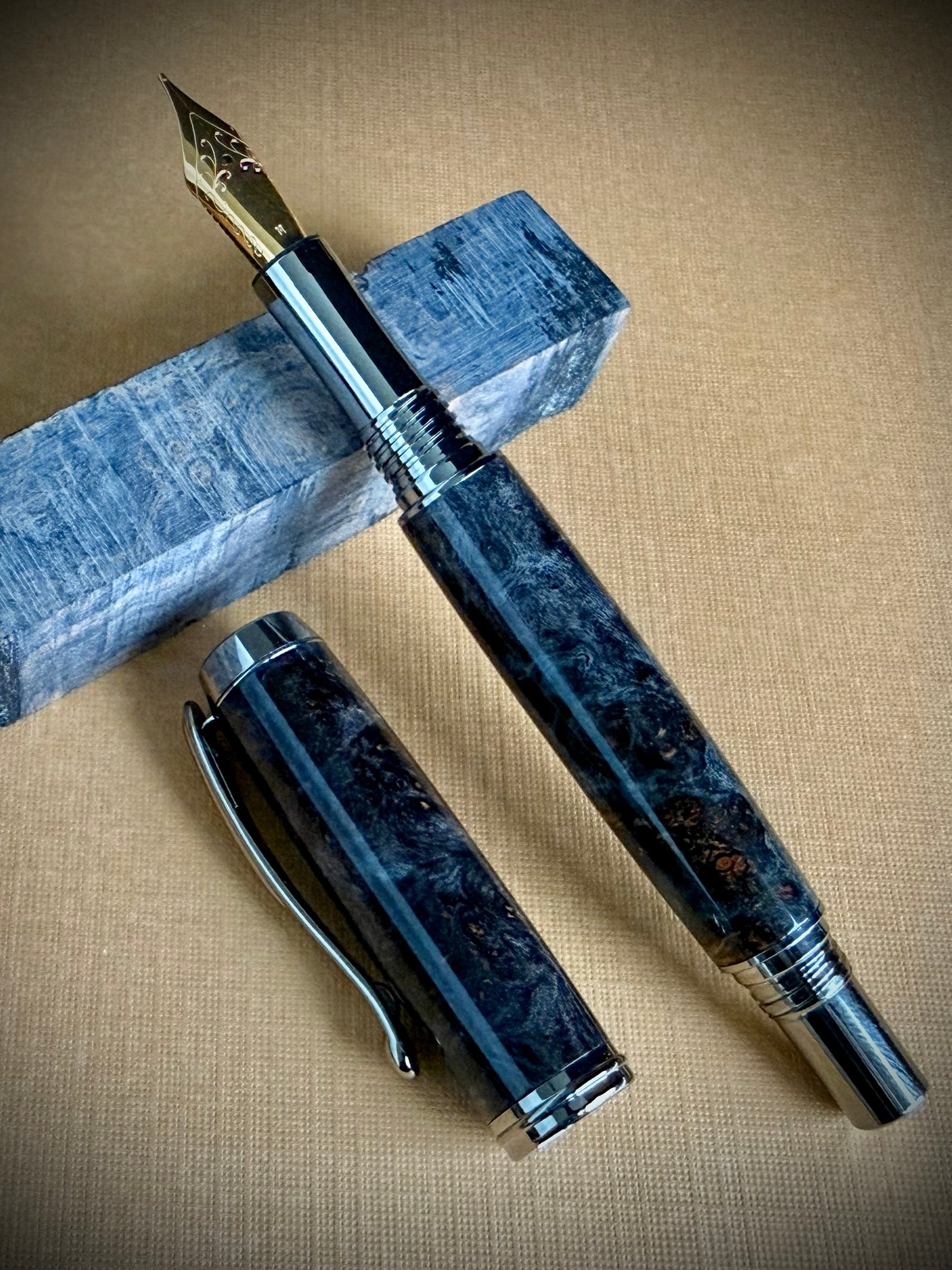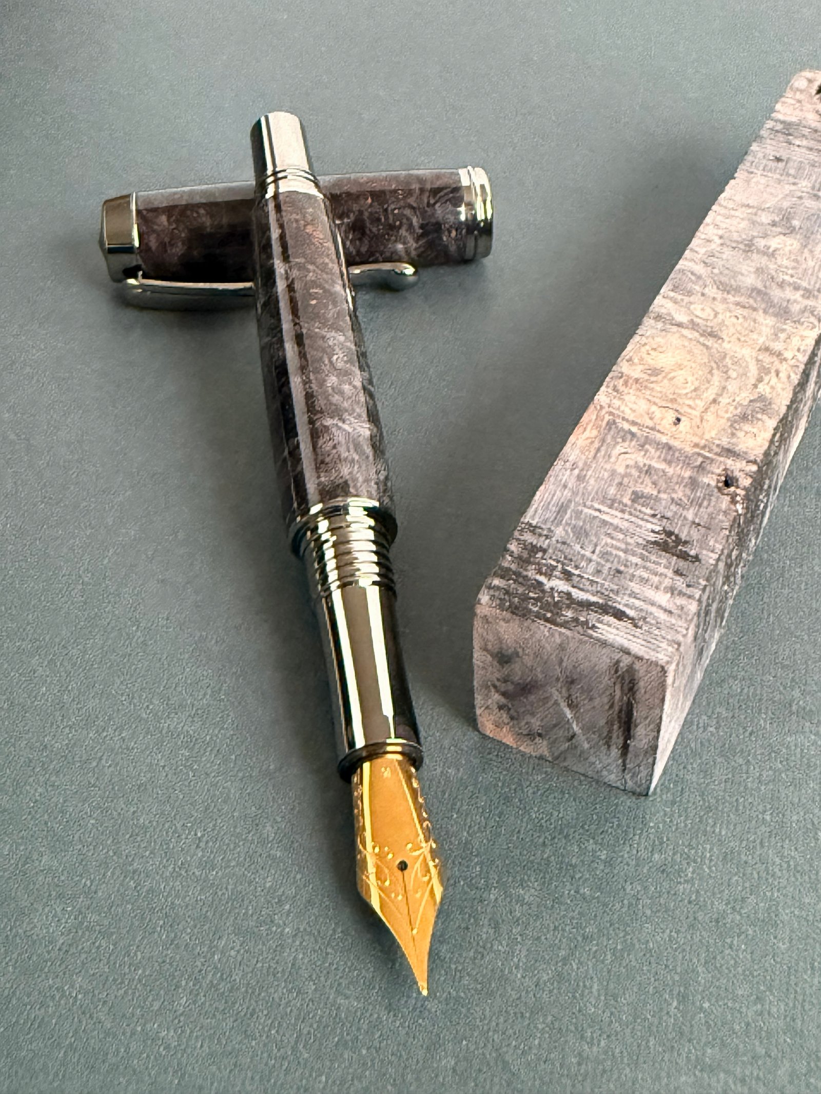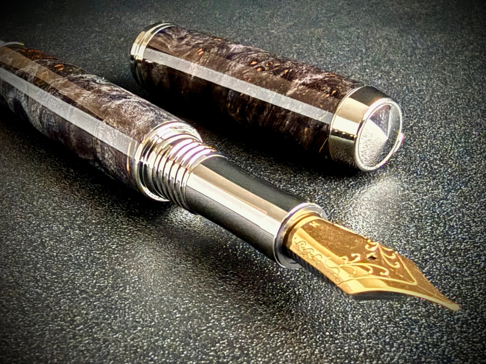 This handcrafted black maple burl fountain pen captures a striking balance between natural complexity and modern elegance. I lathe-turn the dyed and stabilized wood to reveal a dark, swirling grain that resembles a landscape of shadows, ensuring each contour of the pen feels comfortable and balanced in the hand.