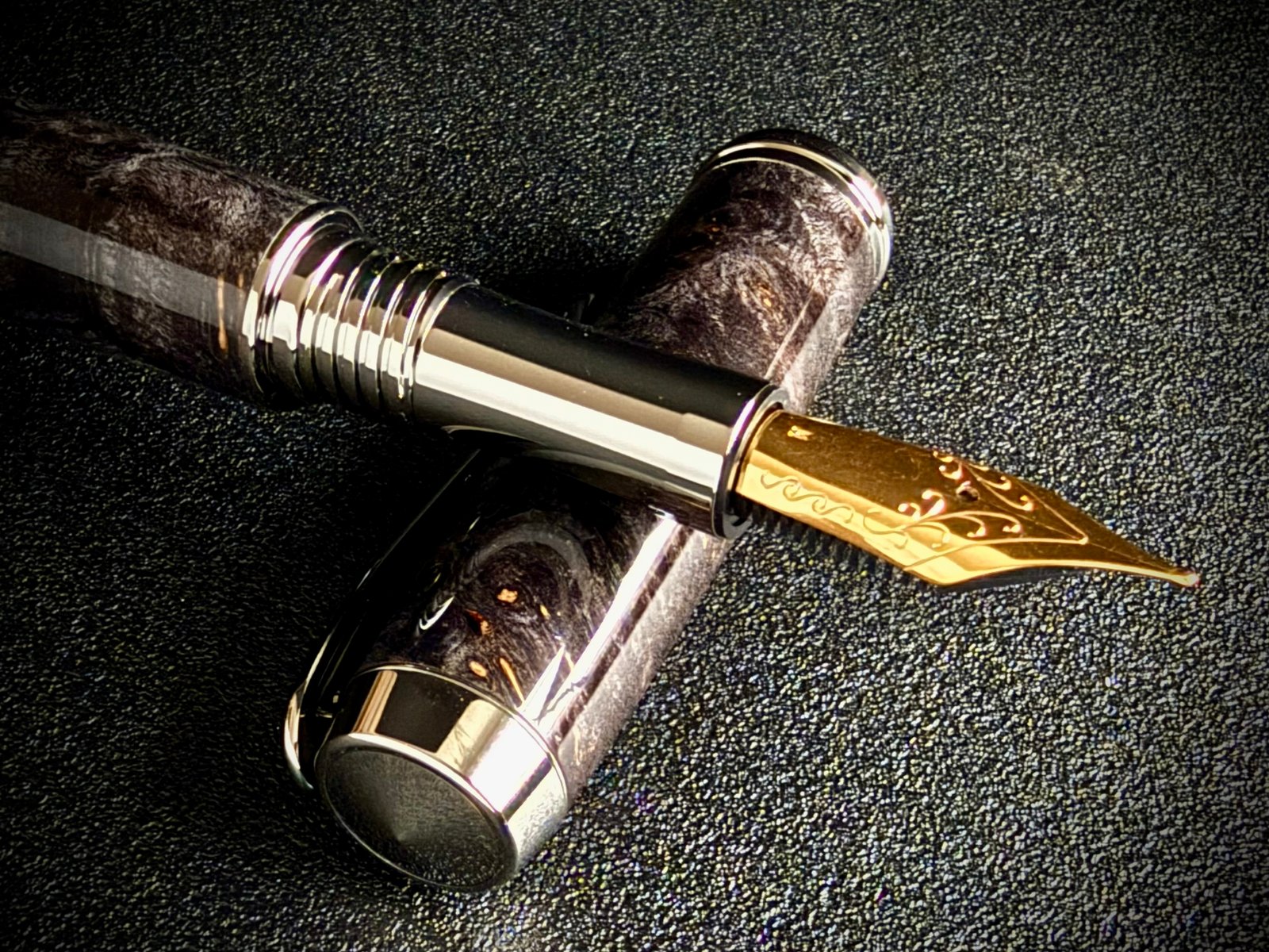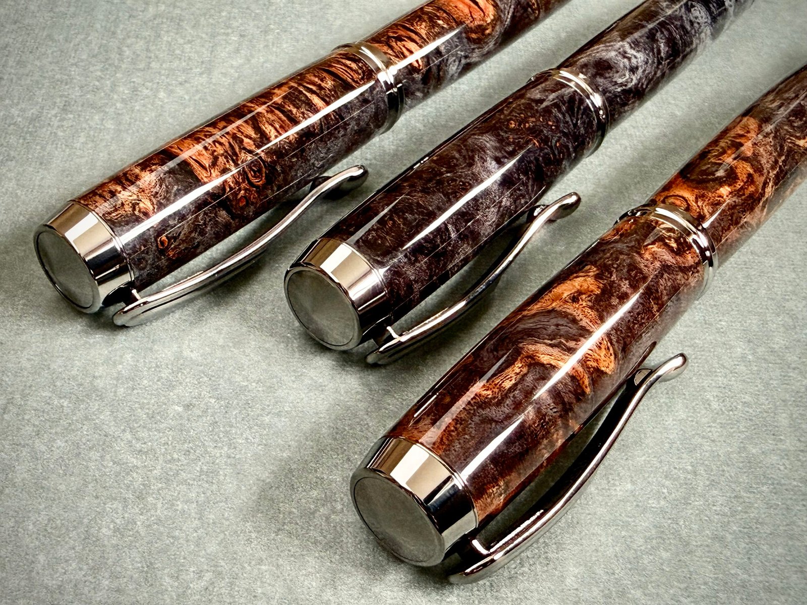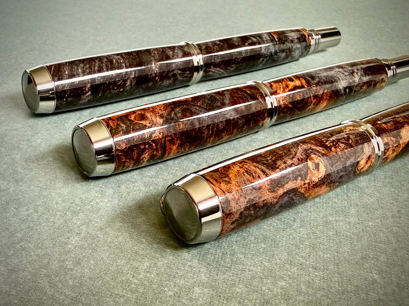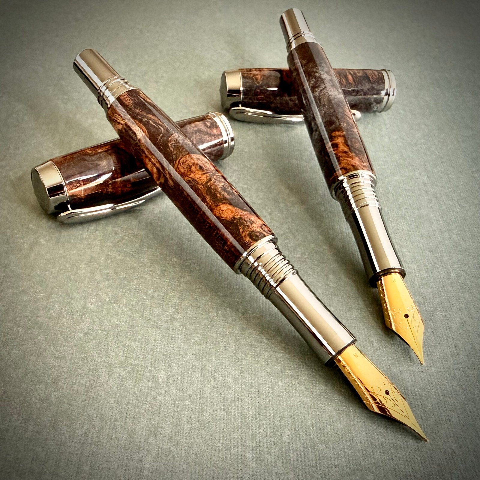 This handcrafted black maple burl fountain pen captures a striking balance between natural complexity and modern elegance. I lathe-turn the dyed and stabilized wood to reveal a dark, swirling grain that resembles a landscape of shadows, ensuring each contour of the pen feels comfortable and balanced in the hand.