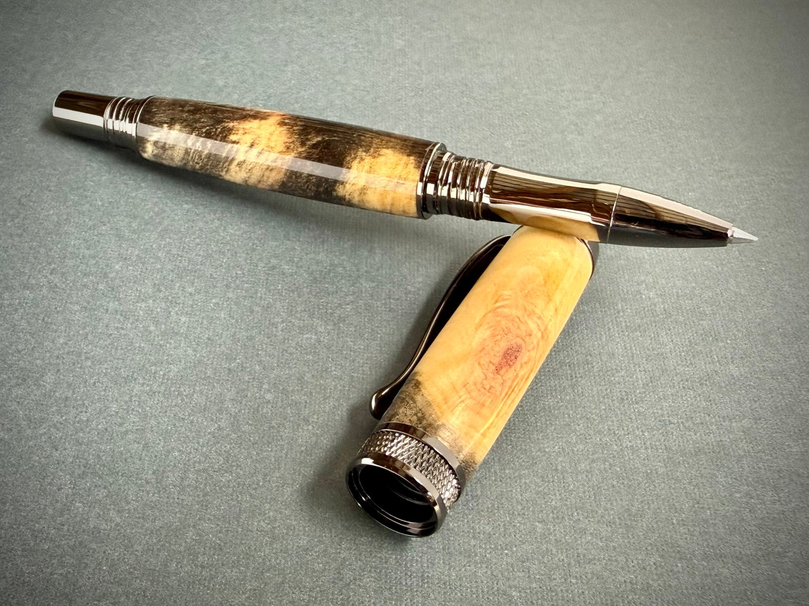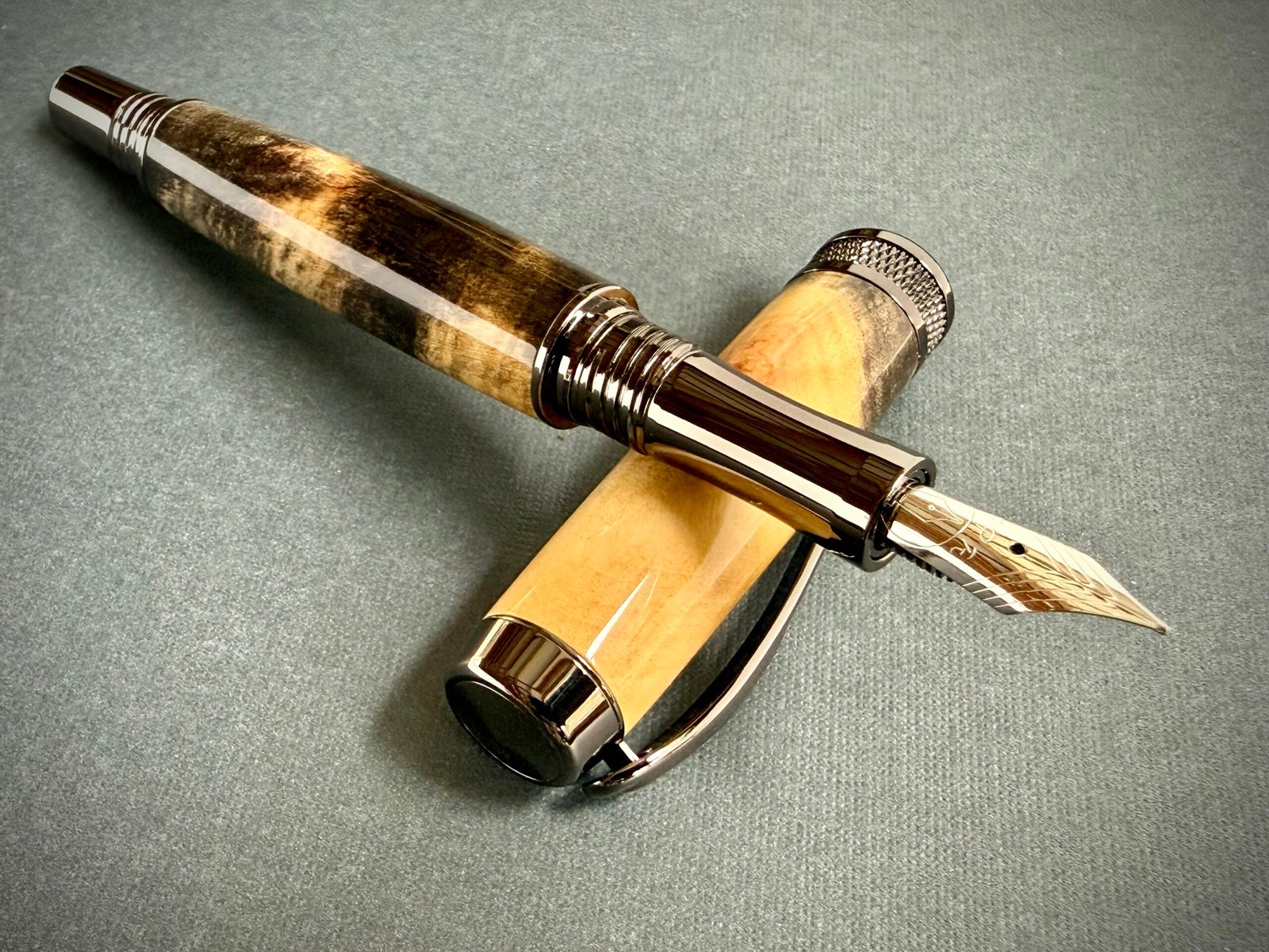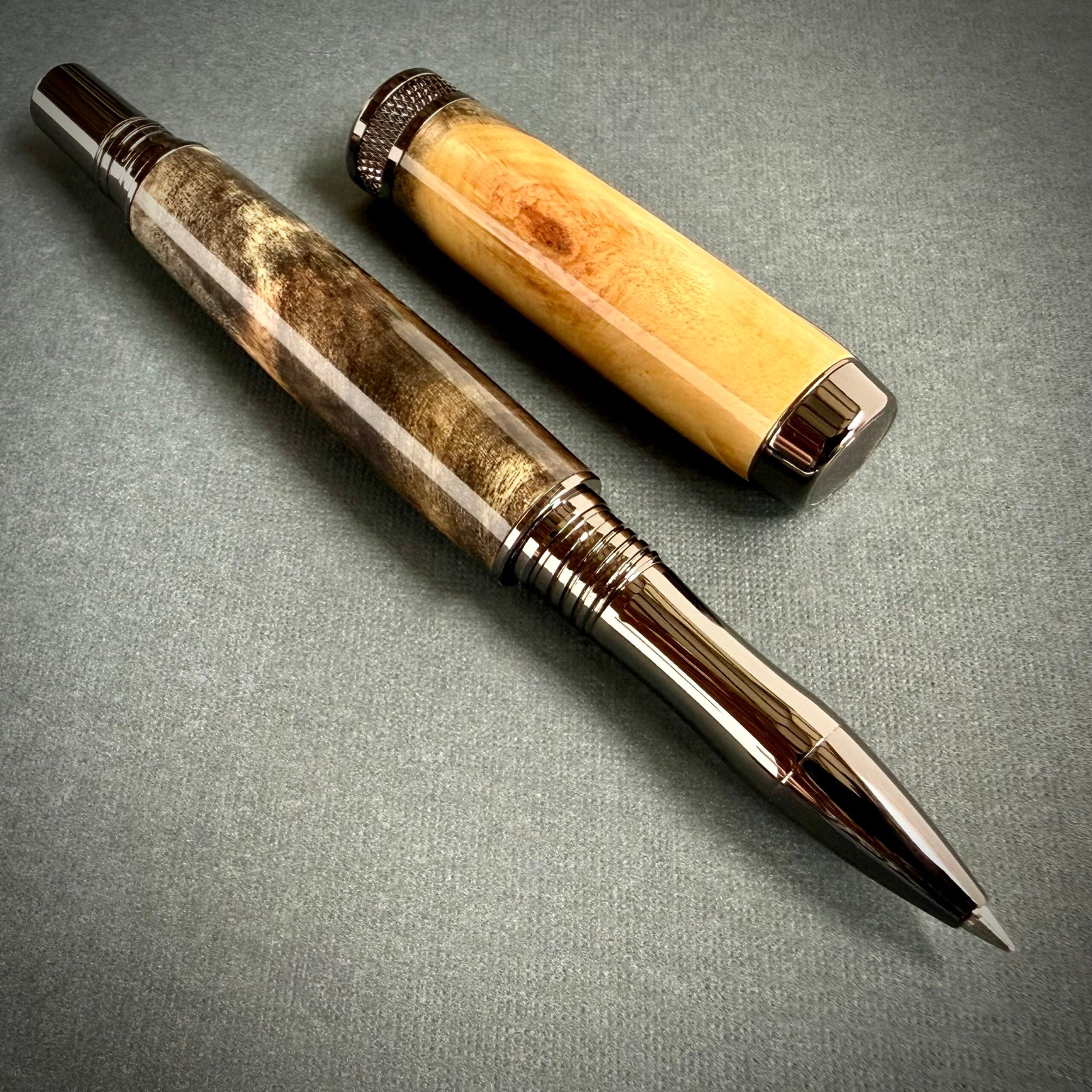 This custom Buckeye Burl Capped Pen features a beautifully figured Buckeye Burl body. The wood was stabilized and then hand-turned, making it dense and durable. After applying and polishing ten coats of cyanoacrylate for a glass-like shine, the finish reveals a complex landscape of natural brown, black, and gray swirls. These organic patterns are complemented by the industrial aesthetic of gunmetal plated components, providing a weighted, solid feel that balances the intricate detail of the wood.