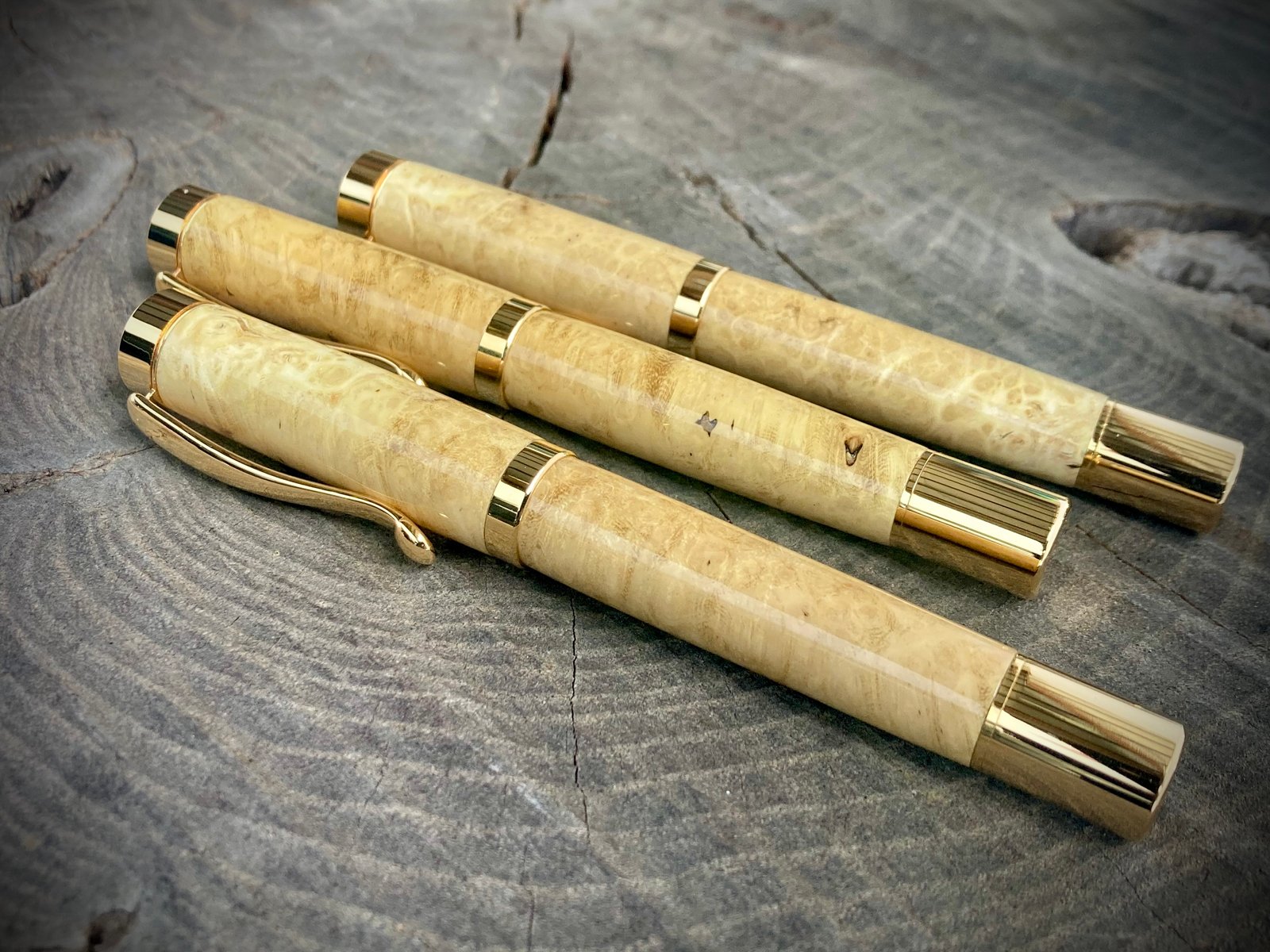 This hand-turned fountain pen showcases a striking Black Locust Burl. The wood boasts a unique heritage, having grown in Croatia from trees imported from North America in the 17th century. Meticulously crafted, the pen features ten coats of cyanoacrylate for an exceptional shine and is accented with gold-alloy plated metal components.
