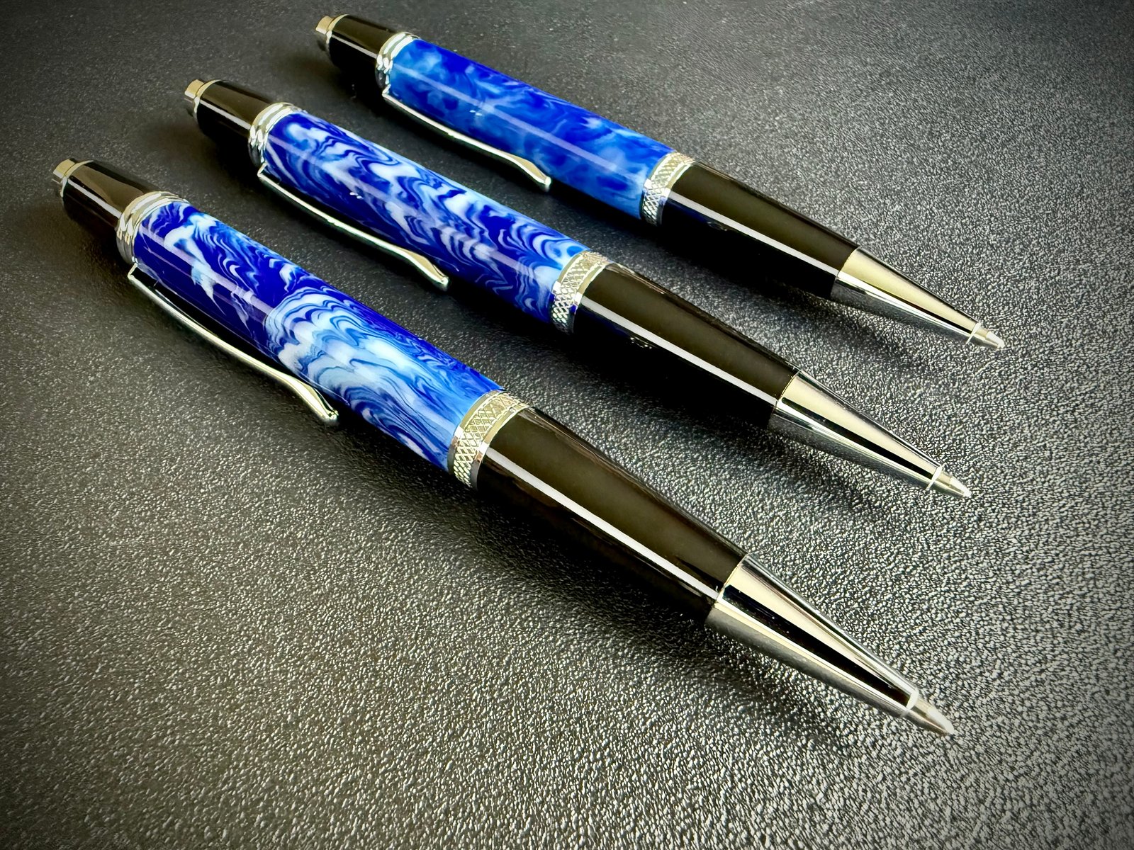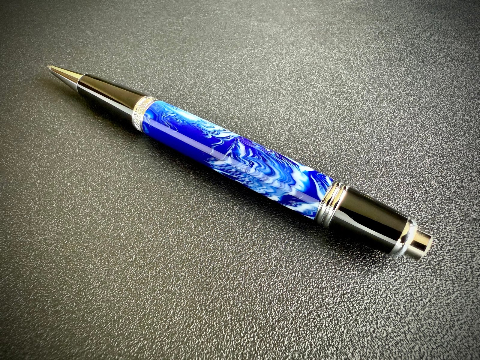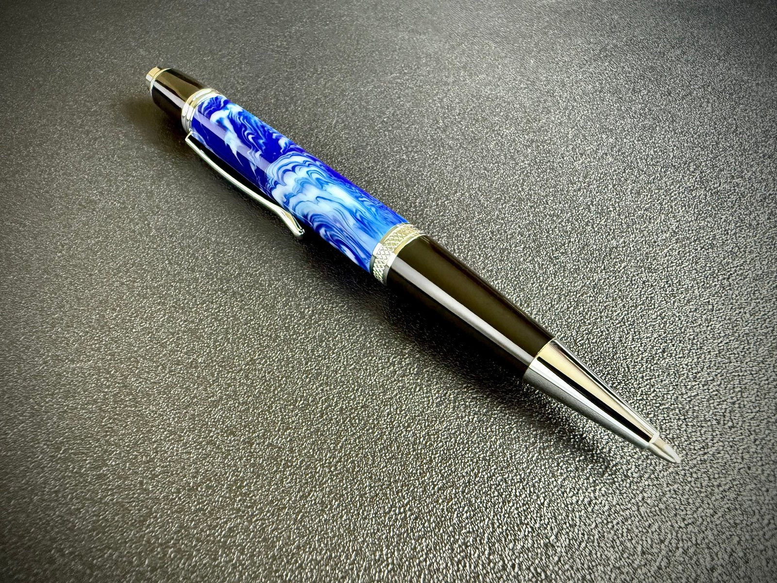 Experience the perfect marriage of artistry and engineering with this Happy Valley Click Pen. This special edition design showcases hand-poured resin, deeply tinted in the unmistakable blue and white that define Happy Valley.