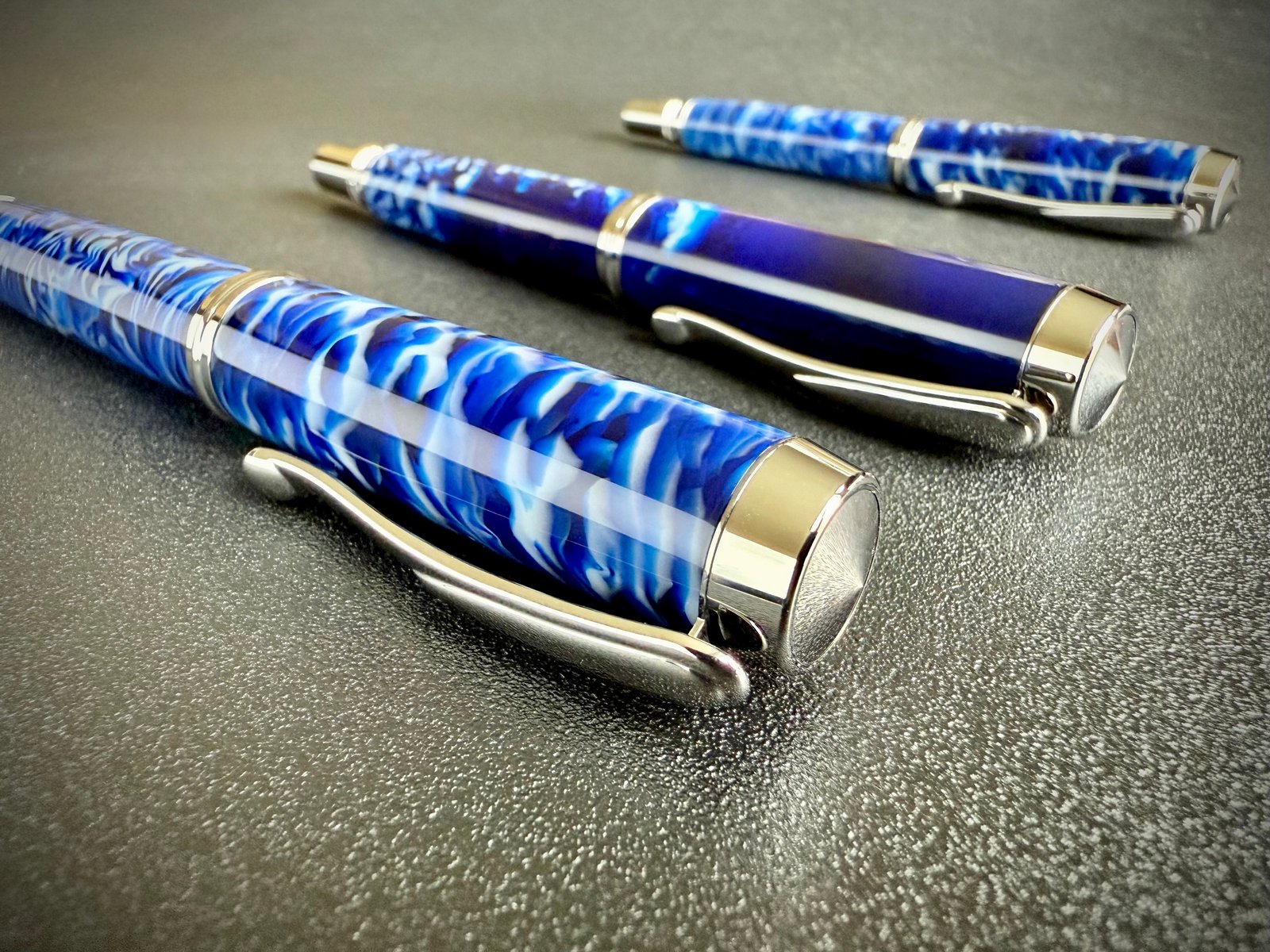 This premium Happy Valley Signature fountain pen is a distinguished writing instrument formed from hand-poured resin, where deep blue and pristine white merge in a vibrant swirl of color. While the combination is recognizable to anyone in Happy Valley, you don’t need to be an alumni to appreciate the artistry of the materials.