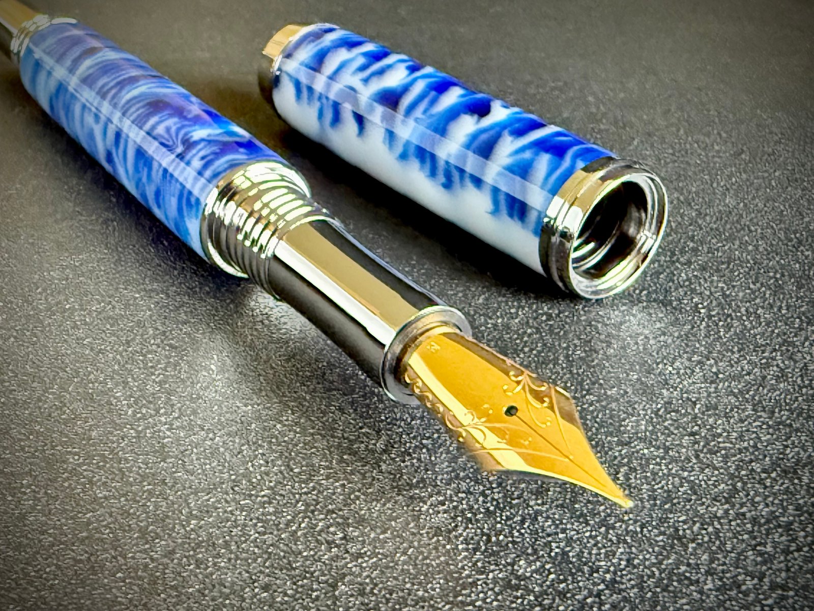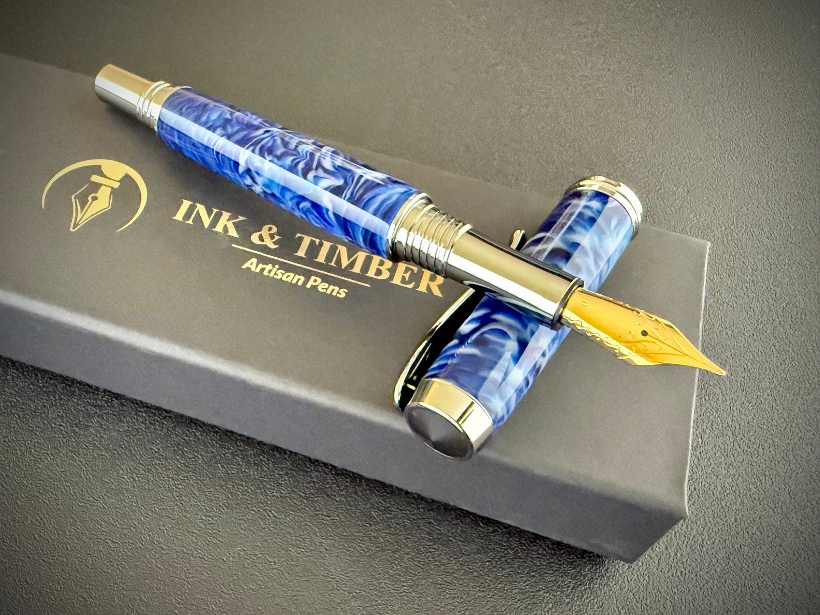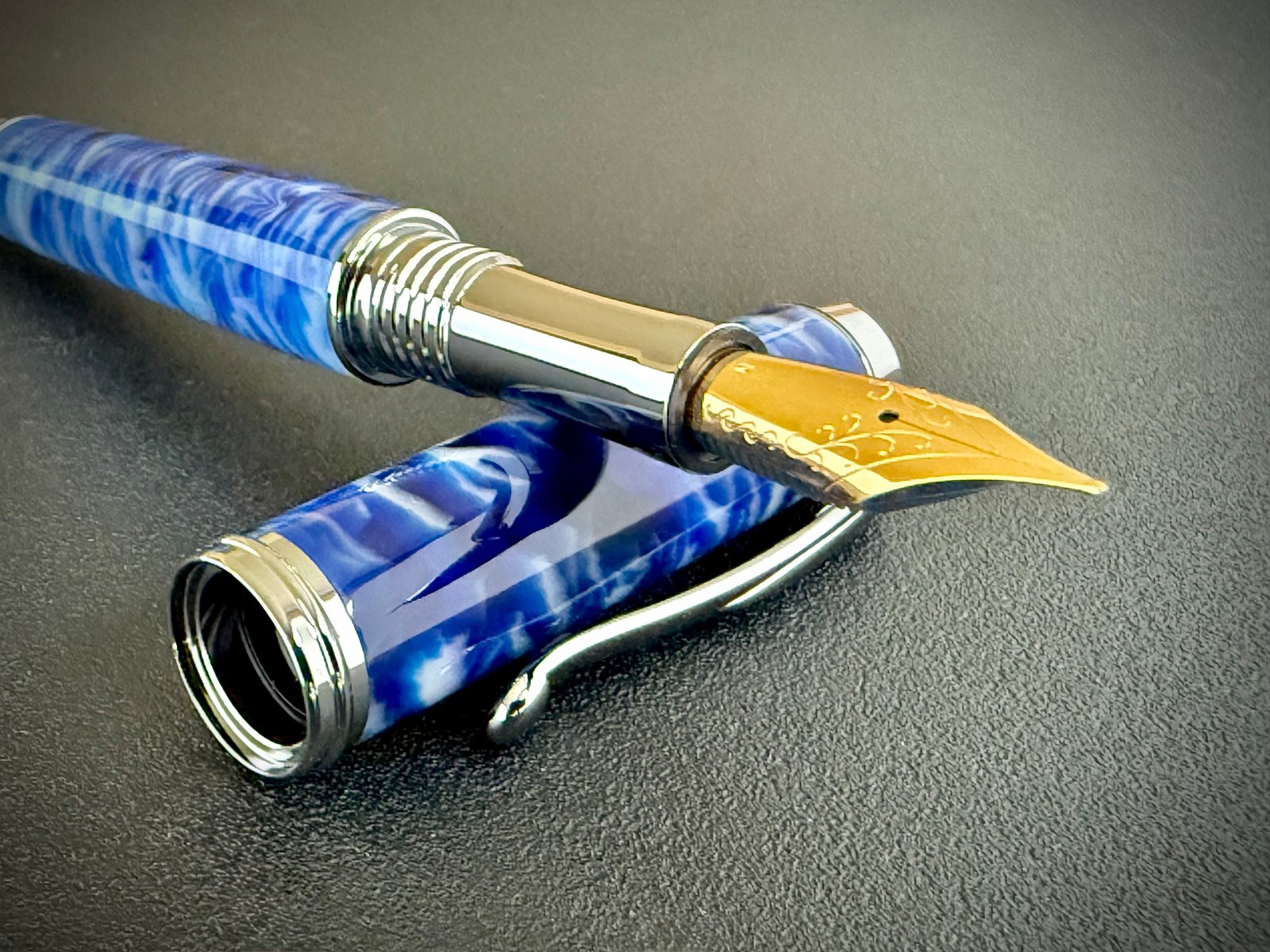 A premium writing instrument showcasing hand-poured resin in the unmistakable blue and white of Happy Valley. Featuring a durable, high-contrast Black Titanium plating and fitted with the smooth, precision-machined German JoWo No. 6 nib, this fountain pen delivers exceptional control and flawless ink flow.