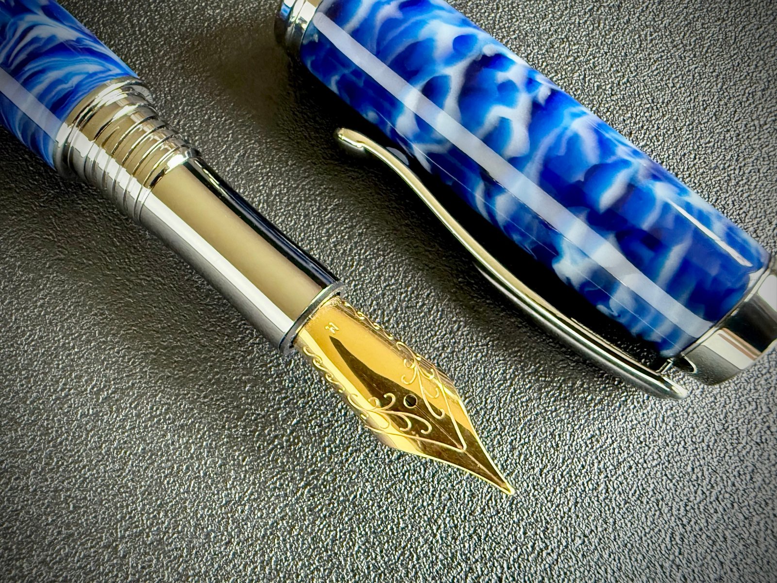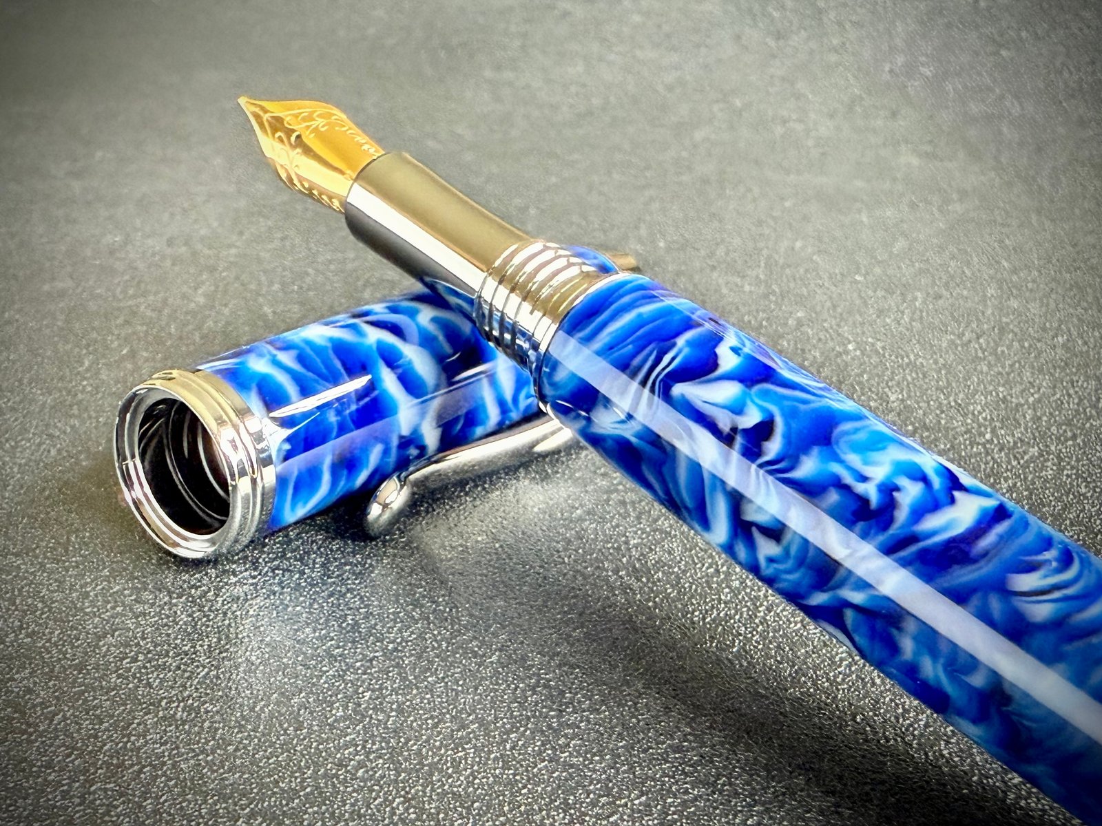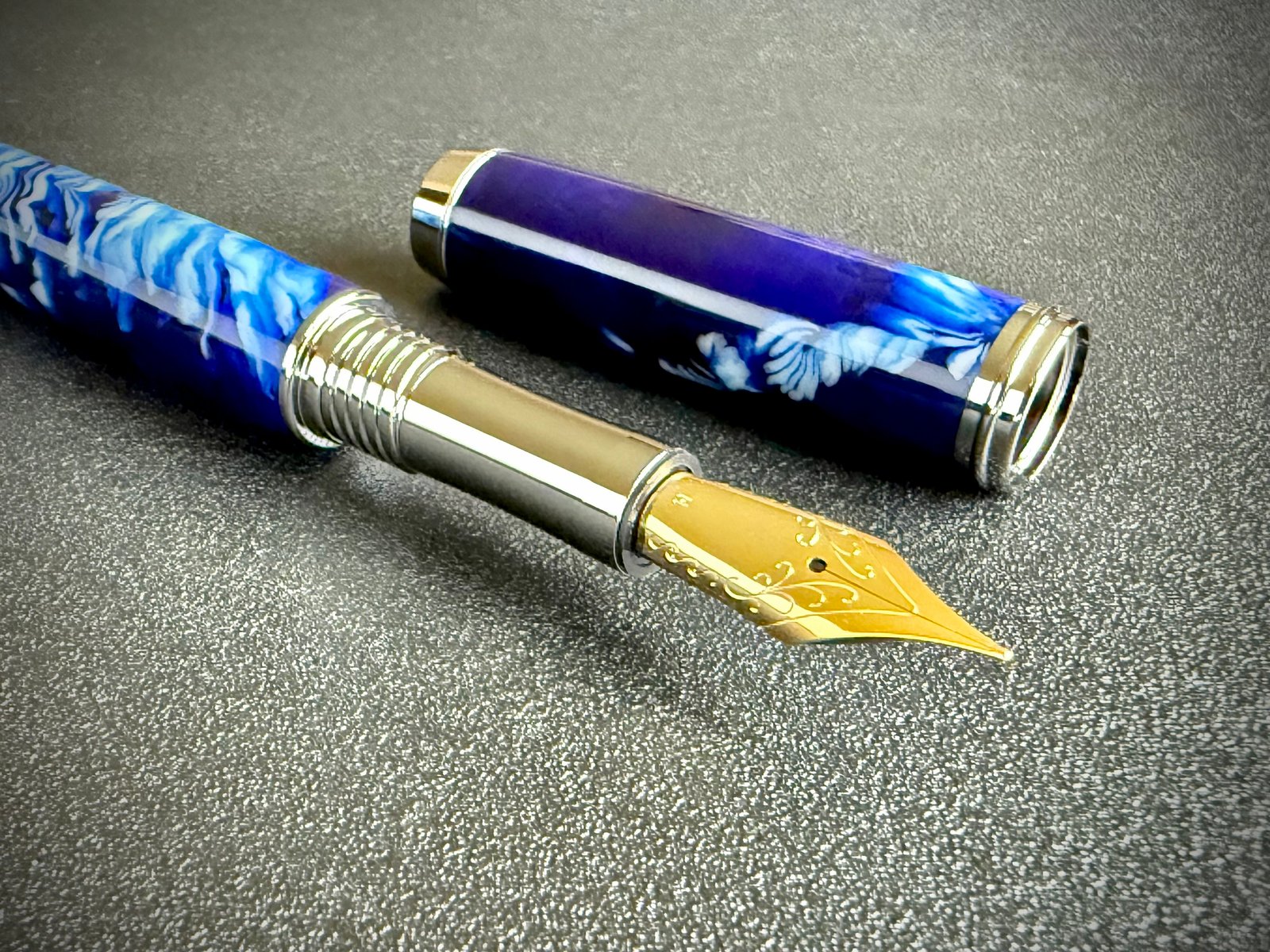 A premium writing instrument showcasing hand-poured resin in the unmistakable blue and white of Happy Valley. Featuring a durable, high-contrast Black Titanium plating and fitted with the smooth, precision-machined German JoWo No. 6 nib, this fountain pen delivers exceptional control and flawless ink flow.