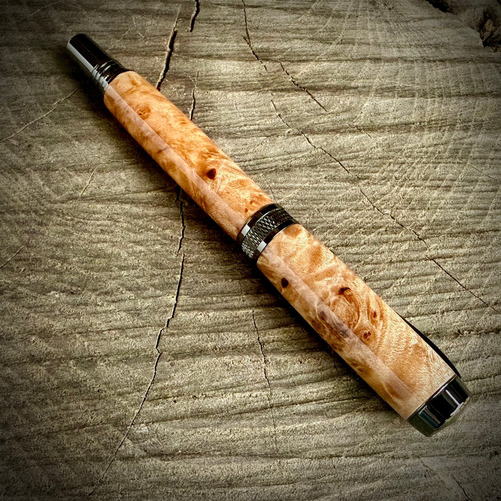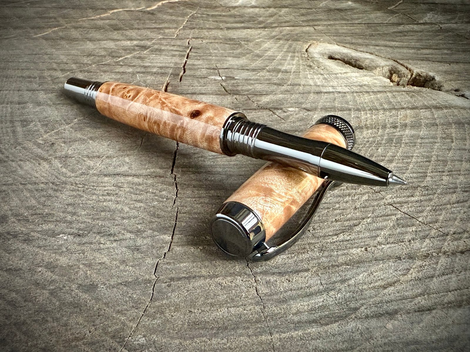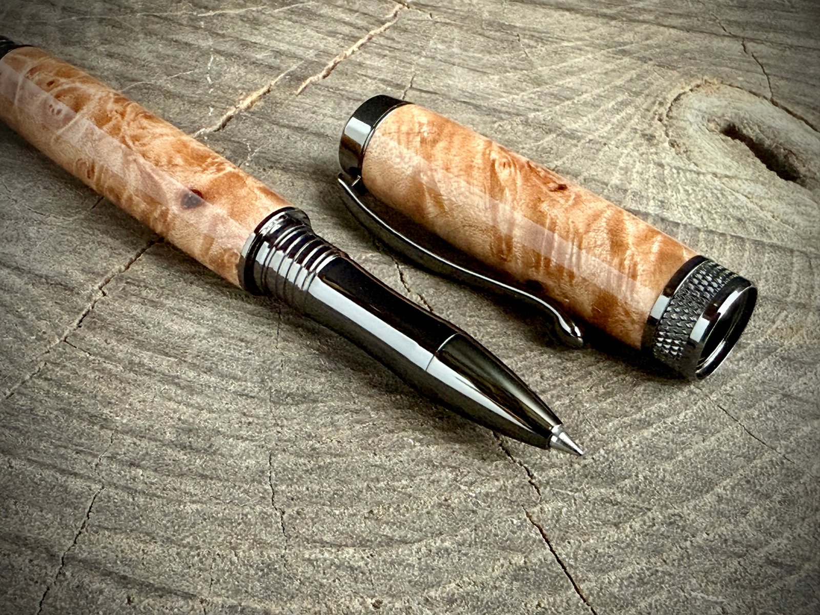 Experience the smooth feel and visual allure of this handcrafted Maple Burl Rollerball pen. The stabilized maple burl, with its unique character, is polished to a deep mirror shine through ten layers of cyanoacrylate finish. A pleasure to hold and behold.