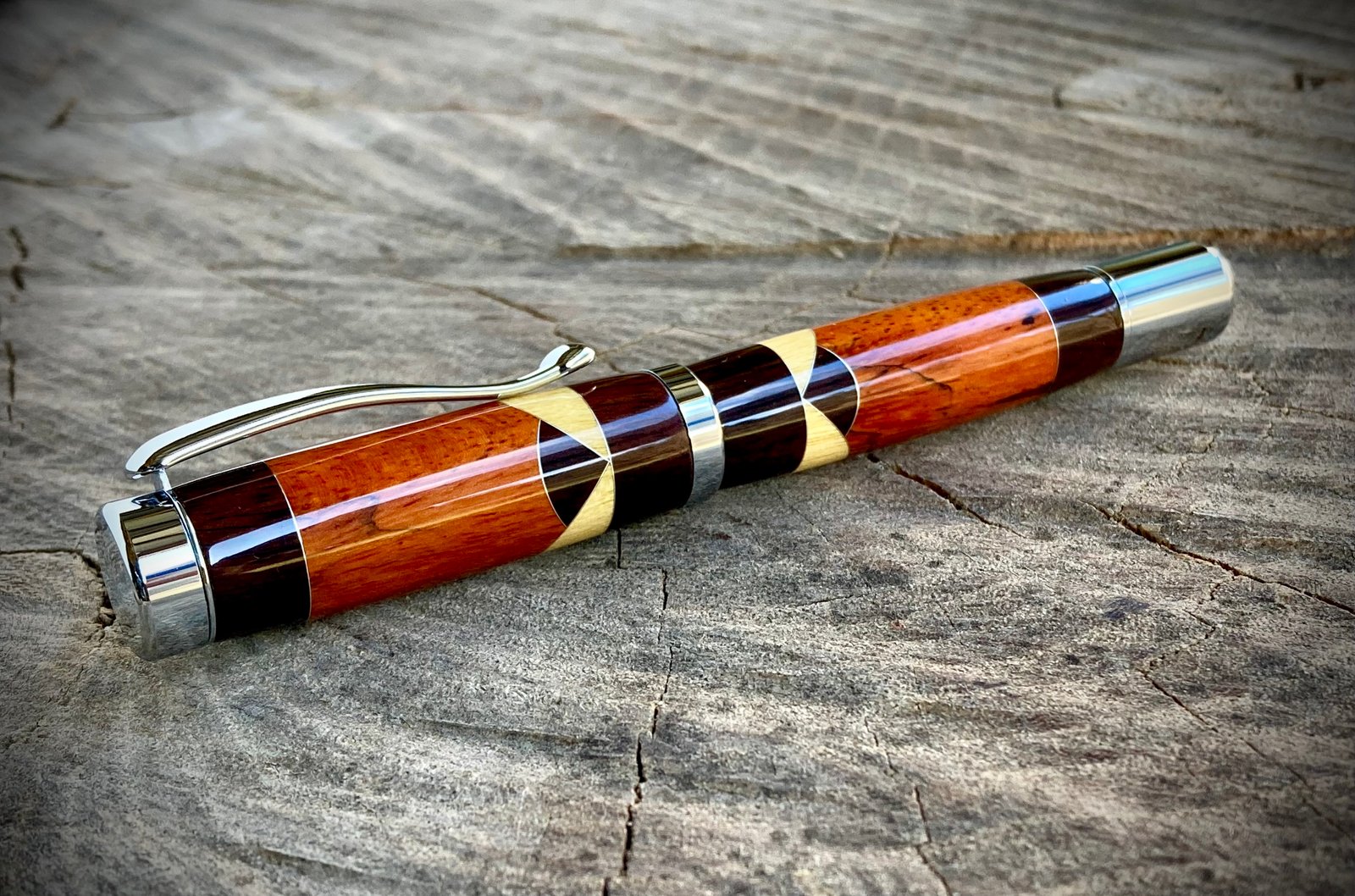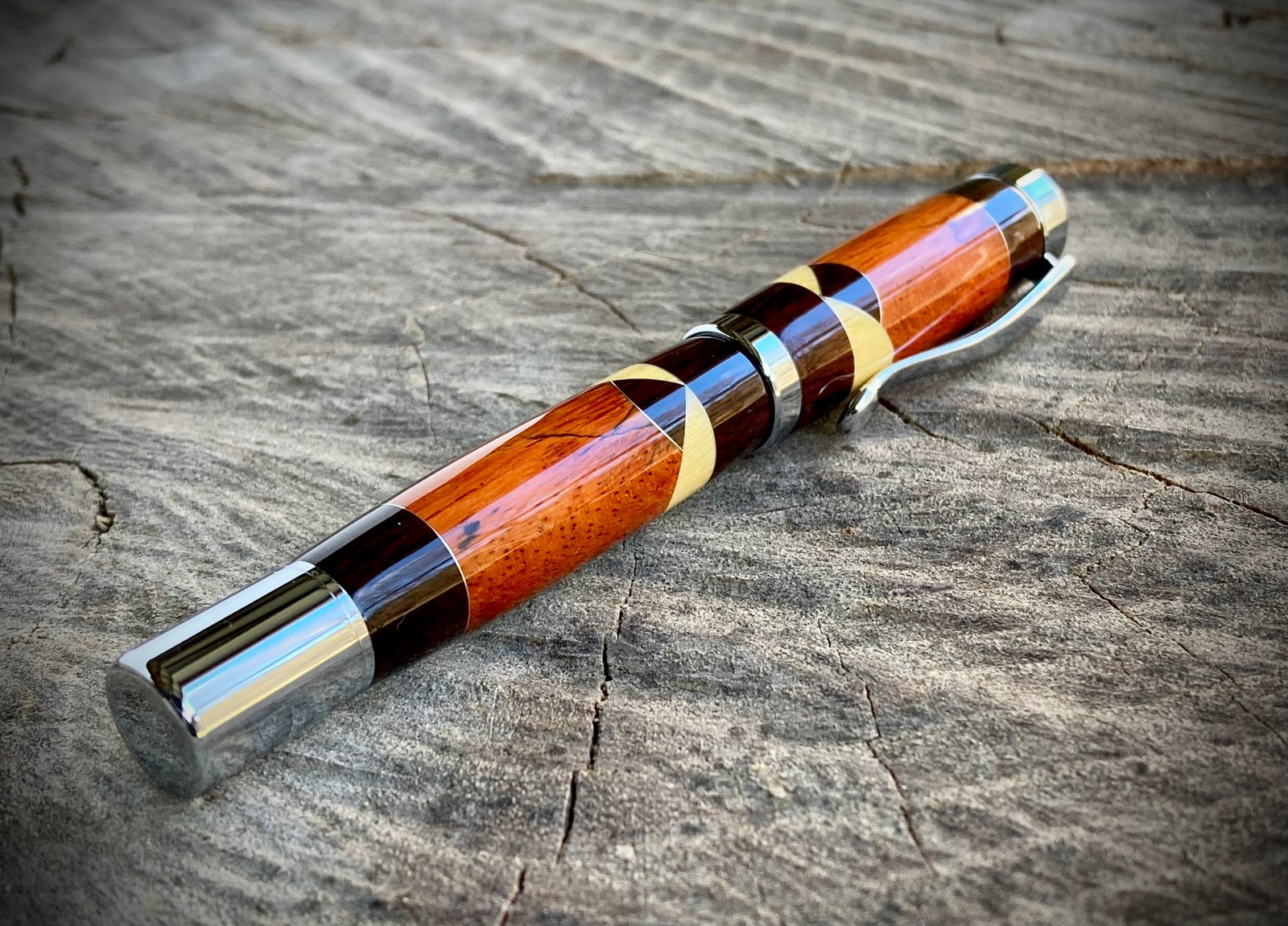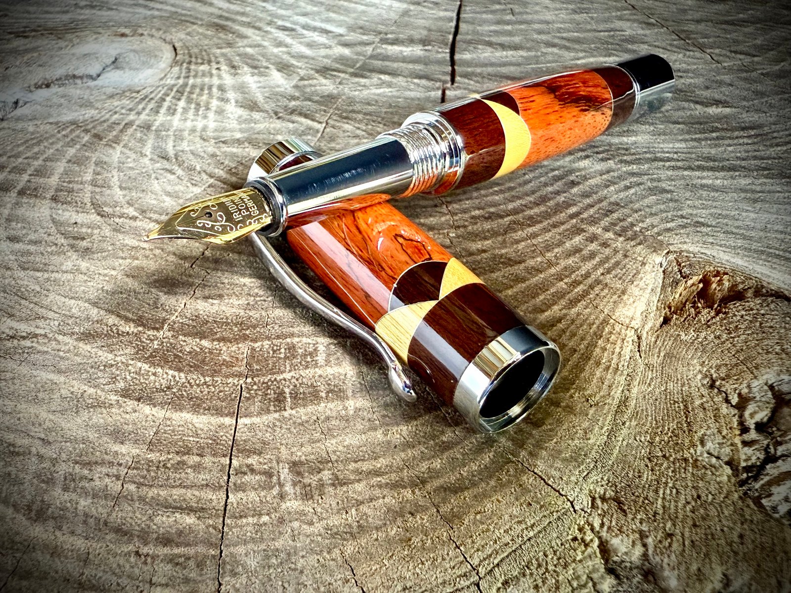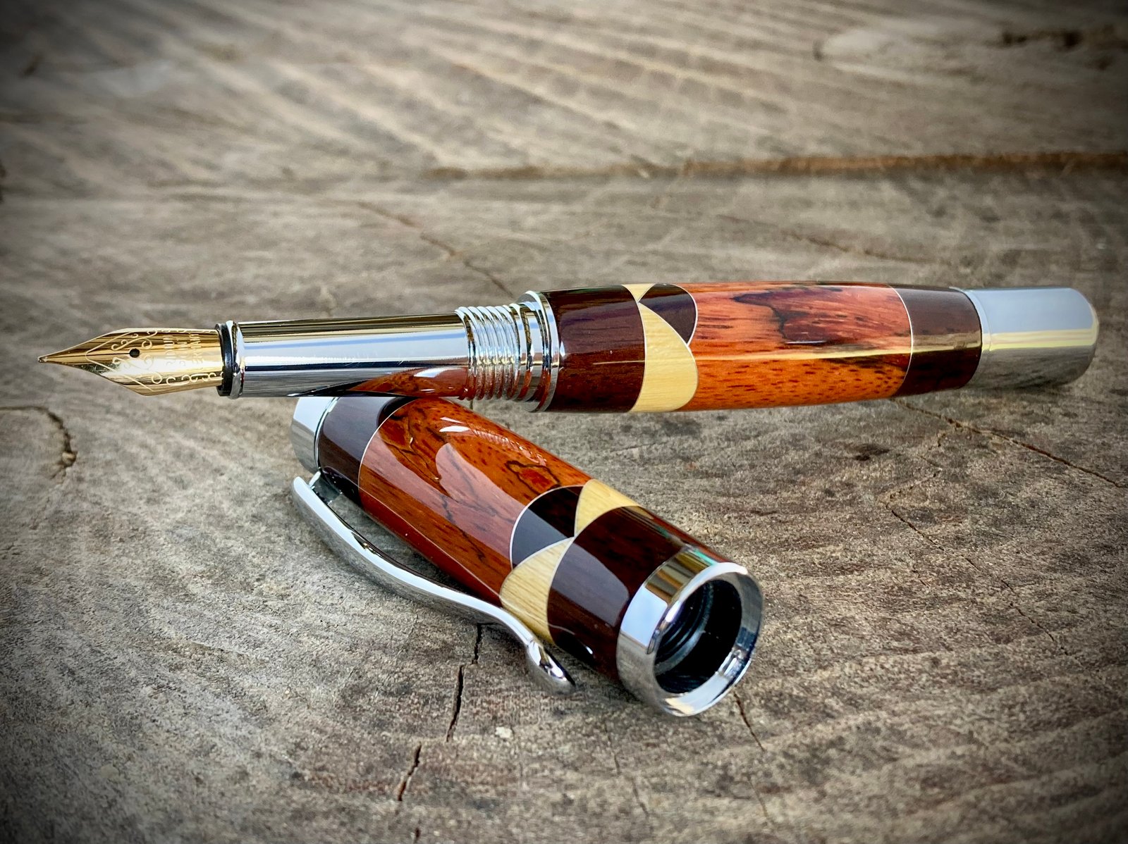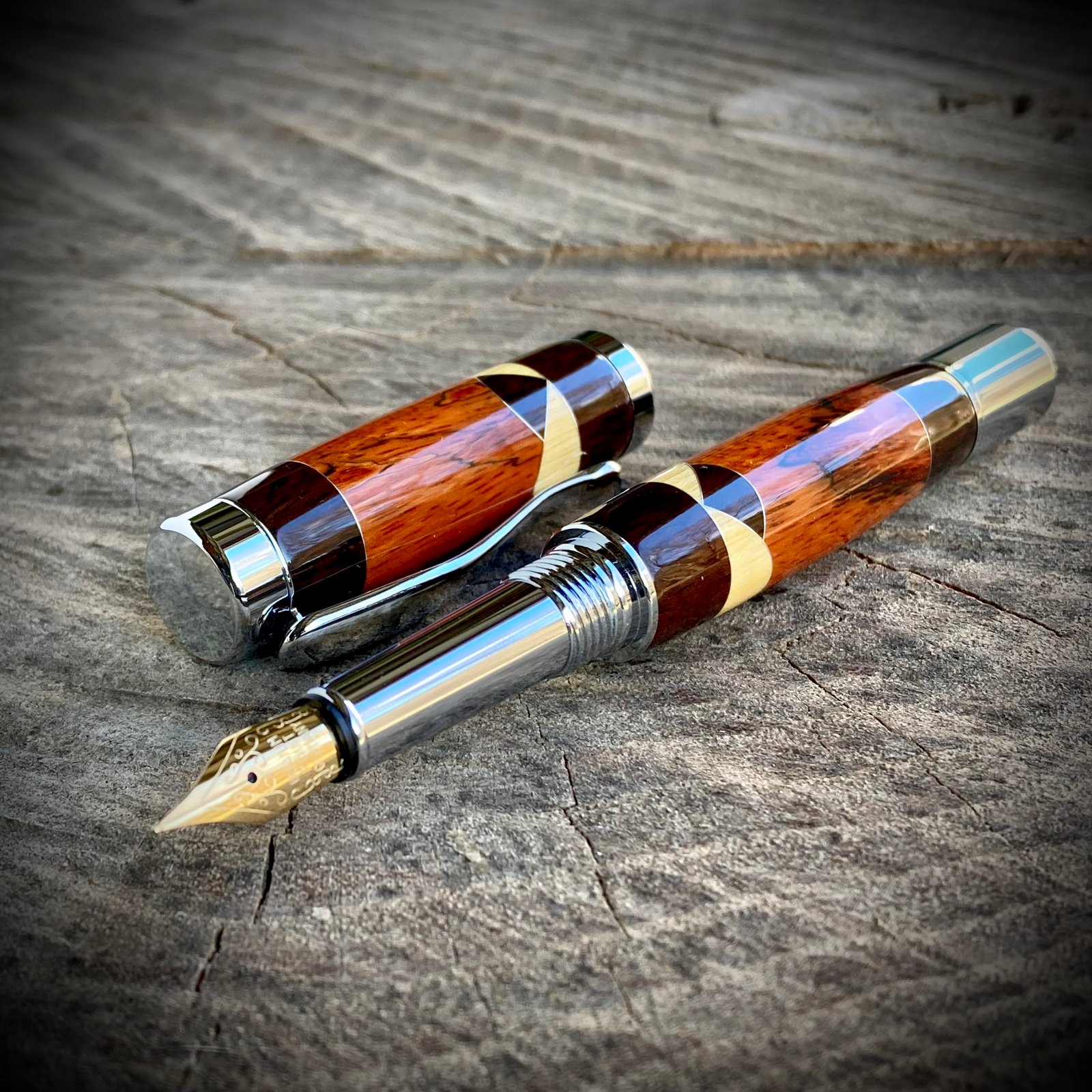 This hand-turned fountain pen was made by combining Orange-Dyed Spalted Tamarind, with Yellowheart and Cocobolo accents. I used aluminum spacers between the wood segments. Once perfectly sized, ten coats of cyanoacrylate were applied and polished to a glass shine. The metal components are chrome plated.